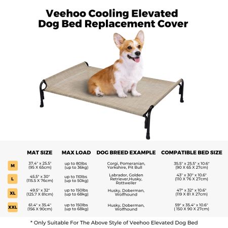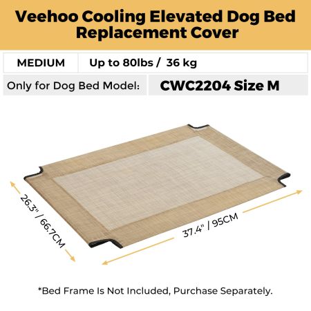 Size Dimensions Weight M 37.4''L×25.5''W 0.80lbs L 45.5''L×30''W 1.30lbs XL 49.5''L×32''W 1.50lbs XXL 61.4''L×35.4''W 1.70lbs Item Number CWCD2204CP Compatible Product Model CWC2204CP Weight 1.00lbs Species Dogs Product Feature Breathable, Chewproof, Cooling Cover Material Teslin Fabric Fill Material N/A Lifestage All Lifestages Assembly Required No Tools Included N/A This Dog bed replacement cover is designed for veehoo bed model: CWC2204CP. Bed frame not included, purchase separately.