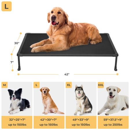 Size Dimensions Weight Suggested Pet Weight M 32"L×25"W×7"H 5.90lbs up to 150lbs L 42"L×30"W×7"H 7.20lbs up to 150lbs XL 49"L×33"W×9"H 8.30lbs up to 150lbs Item Number CWC2203ACP Weight 1.00lbs Species Dogs Bed Shape Rectangular Product Feature Breathable, Cooling, Durable, No-Slip General Material Aluminum, Iron, Plastic Bed Type Elevated Beds Cover Material Teslin Fabric Fill Material N/A Lifestage All Lifestages Assembly Required Yes Tools Included Yes - Video Tutorial