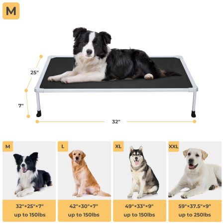 Size Dimensions Weight Suggested Pet Weight M 32"L×25"W×7"H 5.90lbs up to 150lbs L 42"L×30"W×7"H 7.20lbs up to 150lbs XL 49"L×33"W×9"H 8.30lbs up to 150lbs XXL 59"L×37.5"W×9"H 10.20lbs up to 250lbs Item Number CWC2203BCP Weight 1.00lbs Species Dogs Bed Shape Rectangular Product Feature Anti-scratch, Breathable, Chewproof, Elevated General Material Aluminum, Iron, Plastic Bed Type Elevated Beds Cover Material Teslin Fabric Fill Material N/A Lifestage All Lifestages Assembly Required Yes Tools Included Yes - Video Tutorial-1Video Tutorial-2
