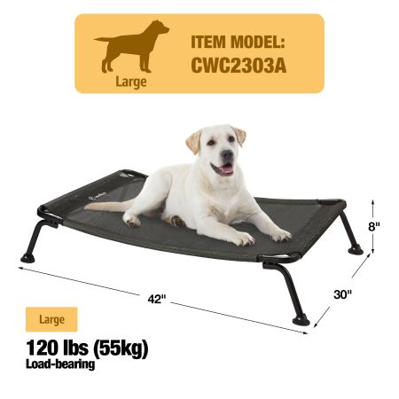 Size Dimensions Weight Suggested Pet Weight M 32''L×25''W×8''H 6.80lbs Up to 100 lbs L 42"L×30''W×8”H 7.70lbs Up to 120 lbs XL 49" L×33"W×8''H 8.60lbs Up to 150 lbs Item Number CWC2303ACP Compatible Product Model CWCD2303CP Weight 1.00lbs Species Dogs Bed Shape Rectangular Product Feature Anti-scratch, Breathable, Chewproof, Durable Bed Type Elevated Beds General Material Iron, Plastic Cover Material Teslin Fabric Fill Material N/A Lifestage All Lifestages Assembly Required Yes Tools Included N/A - Video Tutorial