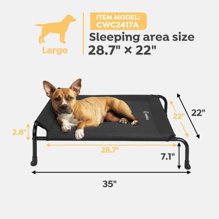 Size Dimensions Sleeping Surface Weight Suggested Pet Weight L 35"L×22"W×7.1"H 35"L×22"W 5.60lbs up to 60lbs XL 41"L×27"W×7.9"H 41"L×27"W 6.70lbs up to 90lbs XXL 47"L×29"W×7. 9"H 47"L×29"W 8.20lbs up to 120lbs Item Number CWC2417ACP Weight 1.00lbs Species Dogs Bed Shape Rectangular Product Feature Breathable, Easy to Clean, No-Slip General Material Iron, Plastic Bed Type Sales Cover Material Teslin Fabric Fill Material N/A Lifestage All Lifestages Assembly Required Yes Tools Included N/A - Video Tutorial