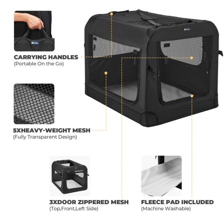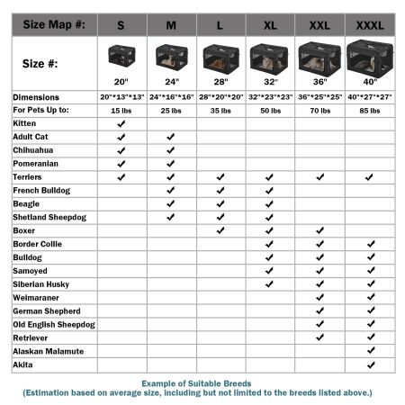 Size Dimensions Weight Suggested Pet Weight M 24''L×16''W×16''H 6.20lbs up to 25lbs L 28''L×20''W×20''H 7.90lbs up to 35lbs XXL 36''L×25''W×25''H 10.50lbs up to 70lbs 3XL 40''L×27''W×27''H 11.70lbs up to 85lbs Item Number CWB1901CP Weight 1.00lbs Species Cats, Dogs Product Feature Collapsible, Durable, Portable General Material Solid Steel Cover Material Oxford Fabric Fill Material N/A Lifestage All Lifestages Assembly Required Yes Tools Included N/A