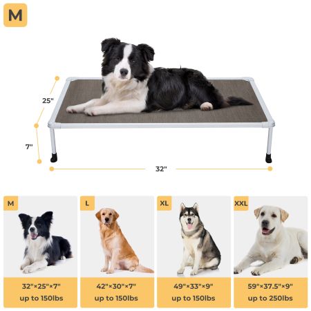 Size Dimensions Weight Suggested Pet Weight M 32"L×25"W×7"H 5.90lbs up to 150lbs L 42"L×30"W×7"H 7.20lbs up to 150lbs XL 49"L×33"W×9"H 8.30lbs up to 150lbs XXL 59"L×37.5"W×9"H 10.20lbs up to 250lbs Item Number CWC2203BCP Weight 1.00lbs Species Dogs Bed Shape Rectangular Product Feature Anti-scratch, Breathable, Chewproof, Elevated General Material Aluminum, Iron, Plastic Bed Type Elevated Beds Cover Material Teslin Fabric Fill Material N/A Lifestage All Lifestages Assembly Required Yes Tools Included Yes - Video Tutorial-1Video Tutorial-2
