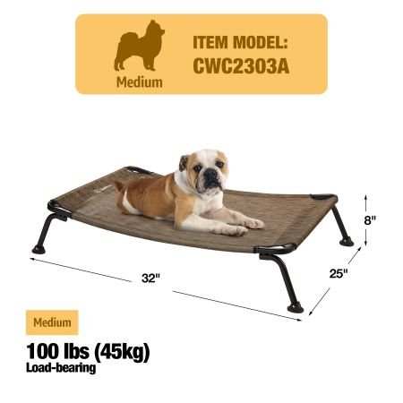 Size Dimensions Weight Suggested Pet Weight M 32''L×25''W×8''H 6.80lbs Up to 100 lbs L 42"L×30''W×8”H 7.70lbs Up to 120 lbs XL 49" L×33"W×8''H 8.60lbs Up to 150 lbs Item Number CWC2303ACP Compatible Product Model CWCD2303CP Weight 1.00lbs Species Dogs Bed Shape Rectangular Product Feature Anti-scratch, Breathable, Chewproof, Durable Bed Type Elevated Beds General Material Iron, Plastic Cover Material Teslin Fabric Fill Material N/A Lifestage All Lifestages Assembly Required Yes Tools Included N/A - Video Tutorial