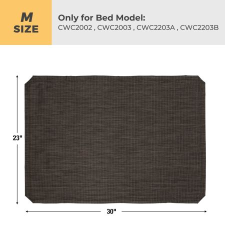 Size Dimensions Weight M 30"L×23"W×0.2"Th 0.80lbs L 40"L×28"W×0.2"Th 1.30lbs XL 47"L×30.5"W×0.2"Th 1.50lbs XXL 58"L×36.5"W×0.2"Th 2.00lbs Item Number CWCD2002CP Compatible Product Model CWC2002,CWC2003,CWC2203A,CWC2203B Weight 1.00lbs Product Feature Breathable, Cooling, Durable Cover Material Teslin Fabric Fill Material N/A Lifestage All Lifestages Assembly Required No Tools Included N/A This dog bed cover is designed for the bed model: CWC2002CP,CWC2003CP,CWC2203ACP,CWC2203BCP. Bed frame not included, purchase separately.