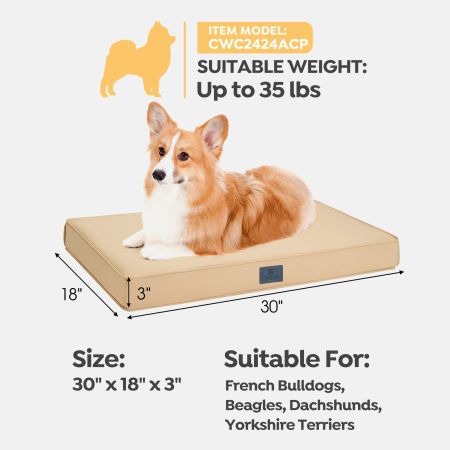 Size Dimensions Weight Suggested Pet Weight XL 41"L×27''W×4''H 5.70lbs up to 90lbs XXL 47"L×29''W×4''H 6.70lbs up to120lbs Item Number CWW2424CP Weight 1.00lbs Species Cats, Dogs Bed Shape Rectangular Product Feature Anti-Slip, Orthopedic, Removable & Washable Cover Cover Material Polyester Bed Type Sales Fill Material Memory Foam Lifestage All Lifestages Assembly Required No Tools Included N/A The cover is removable and can be machine or hand washed.