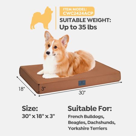 Size Dimensions Weight Suggested Pet Weight XL 41"L×27''W×4''H 5.70lbs up to 90lbs XXL 47"L×29''W×4''H 6.70lbs up to120lbs Item Number CWW2424CP Weight 1.00lbs Species Cats, Dogs Bed Shape Rectangular Product Feature Anti-Slip, Orthopedic, Removable & Washable Cover Cover Material Polyester Bed Type Sales Fill Material Memory Foam Lifestage All Lifestages Assembly Required No Tools Included N/A The cover is removable and can be machine or hand washed.