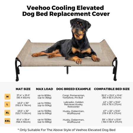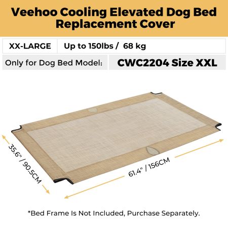 Size Dimensions Weight M 37.4''L×25.5''W 0.80lbs L 45.5''L×30''W 1.30lbs XL 49.5''L×32''W 1.50lbs XXL 61.4''L×35.4''W 1.70lbs Item Number CWCD2204CP Compatible Product Model CWC2204CP Weight 1.00lbs Species Dogs Product Feature Breathable, Chewproof, Cooling Cover Material Teslin Fabric Fill Material N/A Lifestage All Lifestages Assembly Required No Tools Included N/A This Dog bed replacement cover is designed for veehoo bed model: CWC2204CP. Bed frame not included, purchase separately.