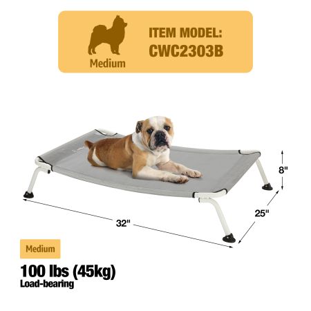 This veehoo cooling curved elevated dog bed is designed for durability and comfort, featuring a premium quality teslin mesh that is tear-resistant and well-ventilated. The bed is available in three sizes to accommodate different dog breeds, with a maximum load capacity ranging from 100 lbs to 150 lbs. The elevated design ensures better airflow and comfort for your pets, making it suitable for all life stages.