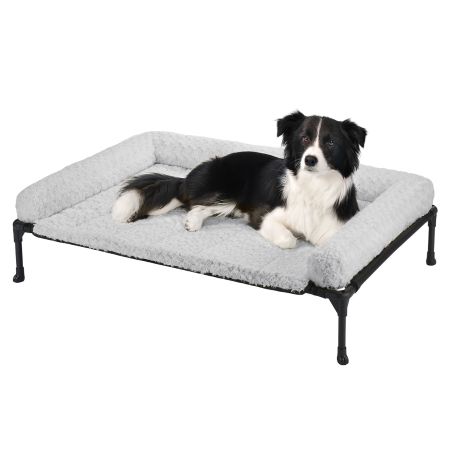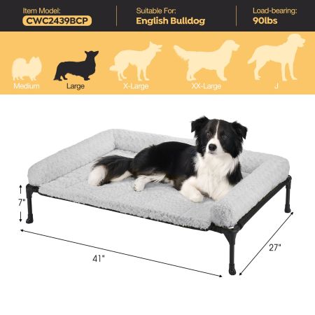 Size Dimensions Weight Suggested Pet Weight M 35"L×22"W×7"H 7.70lbs up to 70lbs L 41"L×27"W×9"H 9.30lbs up to 90lbs XL 47"L×29"W×9"H 11.90lbs up to 150lbs XXL 53"L×33"W×9"H 15.00lbs up to 150lbs 3XL 59"L×37"W×9"H 18.10lbs up to 150lbs Item Number CWC2439BCP Weight 7.70lbs Species Dogs Bed Shape Rectangular Product Feature Breathable, Removable & Washable Mat General Material Iron, Metal Bed Type Elevated Beds Cover Material Faux Fur, Teslin Fabric Fill Material N/A Lifestage All Lifestages Assembly Required Yes Tools Included No - Video Tutorial