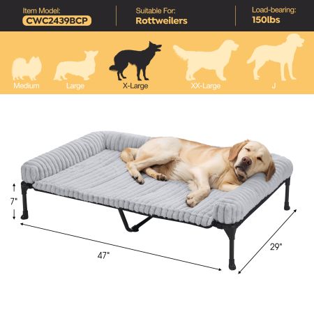 Size Dimensions Weight Suggested Pet Weight L 41"L×27"W×9"H 9.30lbs up to 90lbs XL 47"L×29"W×9"H 11.90lbs up to 150lbs XXL 53"L×33"W×9"H 15.00lbs up to 150lbs Item Number CWC2439CCP Weight 1.00lbs Species Dogs Bed Shape Rectangular Product Feature Breathable, Removable & Washable Mat General Material Iron, Metal Bed Type Elevated Beds Cover Material Faux Fur, Teslin Fabric Fill Material N/A Lifestage All Lifestages Assembly Required Yes Tools Included No - Video Tutorial