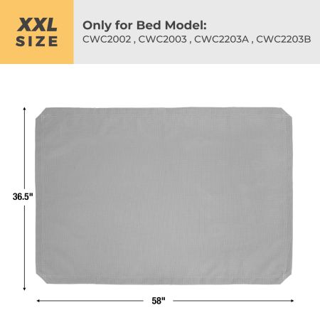 Size Dimensions Weight M 30"L×23"W×0.2"Th 0.80lbs L 40"L×28"W×0.2"Th 1.30lbs XL 47"L×30.5"W×0.2"Th 1.50lbs XXL 58"L×36.5"W×0.2"Th 2.00lbs Item Number CWCD2002CP Compatible Product Model CWC2002,CWC2003,CWC2203A,CWC2203B Weight 1.00lbs Product Feature Breathable, Cooling, Durable Cover Material Teslin Fabric Fill Material N/A Lifestage All Lifestages Assembly Required No Tools Included N/A This dog bed cover is designed for the bed model: CWC2002CP,CWC2003CP,CWC2203ACP,CWC2203BCP. Bed frame not included, purchase separately.