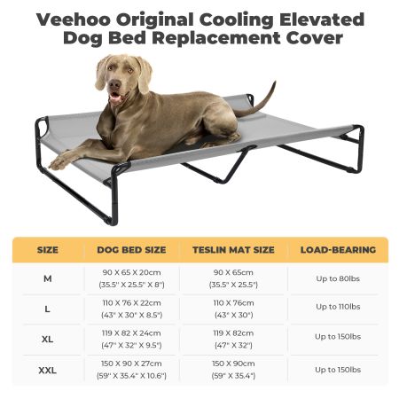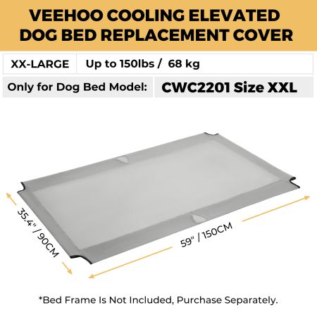 Size Dimensions Weight M 35.5''L×25.5''W 0.80lbs L 43''L×31.5''W 1.30lbs XL 51''L×31.5''W 1.50lbs XXL 59''L×35.5''W 1.70lbs Item Number CWCD2201CP Compatible Product Model CWC2201CP Weight 1.00lbs Species Dogs Product Feature Breathable, Cooling, Durable Cover Material Teslin Fabric Fill Material N/A Lifestage All Lifestages Assembly Required No Tools Included N/A This Dog bed replacement cover is designed for VEEHOO bed model: CWC2201. Bed frame not included, purchase separately.
