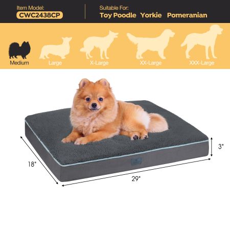 Size Dimensions Weight M 29''L×18''W×3''H 2.50lbs L 35"L×22''W×3”H 3.50lbs XL 41"L×27"W×4"Th 15.65lbs XXL 47"L×29''W×4''H 5.50lbs 3XL 53"L×33''W×4''H 7.90lbs Item Number CWW2438CP Weight 1.00lbs Species Cats, Dogs Bed Shape Rectangular Product Feature Anti-scratch, Chewproof, Waterproof Cover Material Oxford Fabric, Sherpa Fabric Bed Type Beds & Condos Fill Material Orthopedic Foam Lifestage All Lifestages Assembly Required No Tools Included N/A