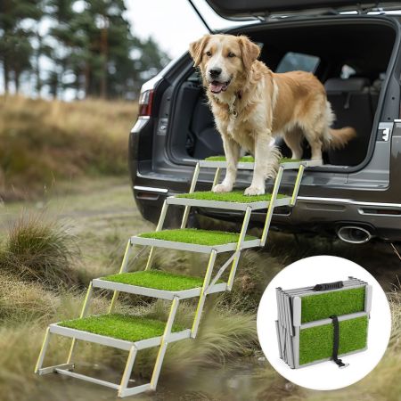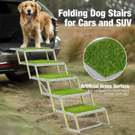 • Veehoo foldable outdoor dog steps for cars and SUV provide a safe and convenient way for pets to access vehicles. The artificial grass surface offers increased friction and anti-slip properties, ensuring pets' safety. The full iron material and stable triangular structure contribute to the stairs' robustness and stability. The reflective strips enhance visibility at night, allowing pets to move around freely. The foldable design makes it easy to store and carry, while the metal carabiner adds extra security. The silicone handle with anti-slip texture ensures a firm grip, and the lightweight construction makes it portable. Ideal for injured, old, or overweight pets, these steps support up to 200 lbs and are designed to prevent joint diseases by allowing dogs to move freely.