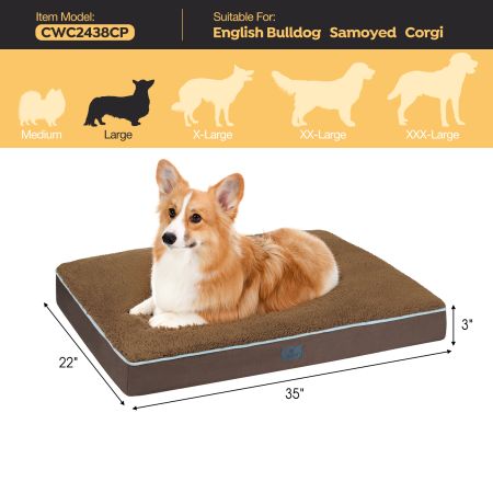 Size Dimensions Weight M 29''L×18''W×3''H 2.50lbs L 35"L×22''W×3”H 3.50lbs XL 41"L×27"W×4"Th 15.65lbs XXL 47"L×29''W×4''H 5.50lbs 3XL 53"L×33''W×4''H 7.90lbs Item Number CWW2438CP Weight 1.00lbs Species Cats, Dogs Bed Shape Rectangular Product Feature Anti-scratch, Chewproof, Waterproof Cover Material Oxford Fabric, Sherpa Fabric Bed Type Beds & Condos Fill Material Orthopedic Foam Lifestage All Lifestages Assembly Required No Tools Included N/A