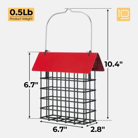 Size Dimensions Weight One-Size 6.7"L×2.8"W×6.7"Th 0.50lbs Item Number WNQ2443CP Dimensions 6.7"L×2.8"W×6.7"Th Weight 0.50lbs Species Birds Bird Species Cardinal, Chickadee, Hummingbird, Oriole, Woodpecker Feeder Type Suet Cake Holder Seed Type Fruit , Suet Cakes Feeder Material Iron Feeder Features Metal Mesh, Rust Resistant, Easy to Refill Mounting Type Hanging Mount Lifestage All Lifestages Assembly Required Yes Tools Included N/A