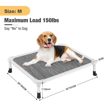 Size Dimensions Weight Suggested Pet Weight M 32''L×25''W×7''H 4.50lbs up to 150lbs L 42''L×30''W×7''H 5.90lbs up to 150lbs XL 49''L×32.5''W×9''H 6.70lbs up to 150lbs XXL 59''L×37.4''W×9''H 8.40lbs up to 250lbs Item Number CWC2003CP Weight 1.00lbs Species Dogs Bed Shape Rectangular Product Feature Breathable, Cooling, Durable, No-Slip General Material Aluminum, Plastic Bed Type Sales Cover Material Teslin Fabric Fill Material N/A Lifestage All Lifestages Assembly Required Yes Tools Included Yes - Video Tutorial