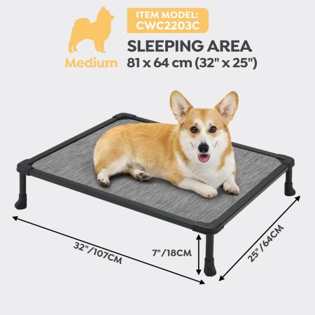 Size Dimensions Weight XXL 59"L×37.4"W×9"H 10.20lbs Item Number CWC2203CCP Weight 1.00lbs Species Dogs Bed Shape Rectangular Product Feature Anti-scratch, Breathable, Chewproof, Elevated General Material Aluminum, Iron, Plastic Bed Type Elevated Beds Cover Material Teslin Fabric Fill Material N/A Lifestage All Lifestages Assembly Required Yes Tools Included Yes - Video Tutorial