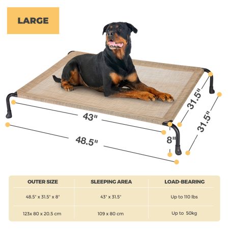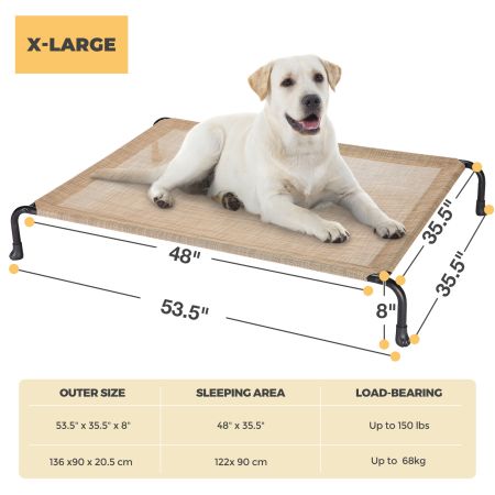 Size Dimensions Sleeping Surface Weight Suggested Pet Weight XL 53.5"L×35.5"W×8"H 48''L×35.5''W 9.90lbs up to 110lbs Item Number CWC2205CP Weight 1.00lbs Species Dogs Bed Shape Rectangular Product Feature Anti-scratch, Breathable, Chewproof, Durable General Material Iron, Plastic Bed Type Elevated Beds Cover Material Teslin Fabric Fill Material N/A Lifestage All Lifestages Assembly Required Yes Tools Included N/A - Video Tutorial