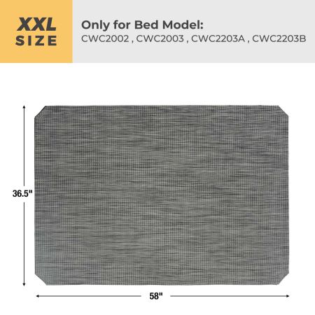 Size Dimensions Weight M 30"L×23"W×0.2"Th 0.80lbs L 40"L×28"W×0.2"Th 1.30lbs XL 47"L×30.5"W×0.2"Th 1.50lbs XXL 58"L×36.5"W×0.2"Th 2.00lbs Item Number CWCD2002CP Compatible Product Model CWC2002,CWC2003,CWC2203A,CWC2203B Weight 1.00lbs Product Feature Breathable, Cooling, Durable Cover Material Teslin Fabric Fill Material N/A Lifestage All Lifestages Assembly Required No Tools Included N/A This dog bed cover is designed for the bed model: CWC2002CP,CWC2003CP,CWC2203ACP,CWC2203BCP. Bed frame not included, purchase separately.