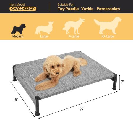 Size Dimensions Weight L 35"L×22"W×7"H 8.20lbs XL 41"L×27"W×8"H 9.30lbs XXL 47"L×29"W×8"H 11.00lbs Item Number CWC2433CP Weight 1.00lbs Species Dogs Bed Shape Rectangular Product Feature Durable, No-Slip, Stable General Material Iron, Metal, Plastic Bed Type Sales Cover Material Teslin Fabric Fill Material N/A Lifestage All Lifestages Assembly Required Yes Tools Included Yes - Video Tutorial
