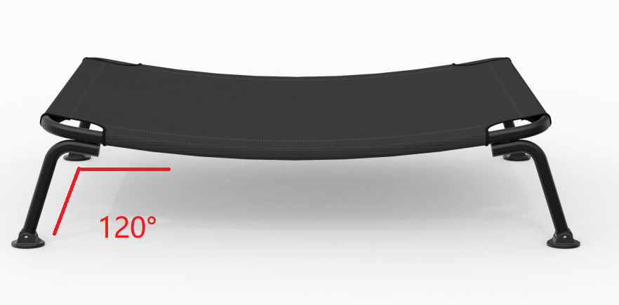 To bear the curved side rails’ load, we bent the legs 120 degrees to cling tightly to the rails, transferring force downwards most efficiently vs. vertical legs.