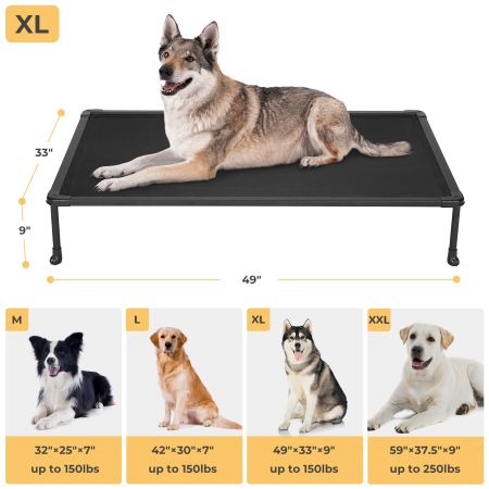 Size Dimensions Weight Suggested Pet Weight M 32"L×25"W×7"H 5.90lbs up to 150lbs L 42"L×30"W×7"H 7.20lbs up to 150lbs XL 49"L×33"W×9"H 8.30lbs up to 150lbs Item Number CWC2203ACP Weight 1.00lbs Species Dogs Bed Shape Rectangular Product Feature Breathable, Cooling, Durable, No-Slip General Material Aluminum, Iron, Plastic Bed Type Elevated Beds Cover Material Teslin Fabric Fill Material N/A Lifestage All Lifestages Assembly Required Yes Tools Included Yes - Video Tutorial