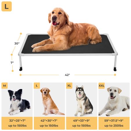 Size Dimensions Weight Suggested Pet Weight M 32"L×25"W×7"H 5.90lbs up to 150lbs L 42"L×30"W×7"H 7.20lbs up to 150lbs XL 49"L×33"W×9"H 8.30lbs up to 150lbs XXL 59"L×37.5"W×9"H 10.20lbs up to 250lbs Item Number CWC2203BCP Weight 1.00lbs Species Dogs Bed Shape Rectangular Product Feature Anti-scratch, Breathable, Chewproof, Elevated General Material Aluminum, Iron, Plastic Bed Type Elevated Beds Cover Material Teslin Fabric Fill Material N/A Lifestage All Lifestages Assembly Required Yes Tools Included Yes - Video Tutorial-1Video Tutorial-2