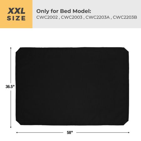 Size Dimensions Weight M 30"L×23"W×0.2"Th 0.80lbs L 40"L×28"W×0.2"Th 1.30lbs XL 47"L×30.5"W×0.2"Th 1.50lbs XXL 58"L×36.5"W×0.2"Th 2.00lbs Item Number CWCD2002CP Compatible Product Model CWC2002,CWC2003,CWC2203A,CWC2203B Weight 1.00lbs Product Feature Breathable, Cooling, Durable Cover Material Teslin Fabric Fill Material N/A Lifestage All Lifestages Assembly Required No Tools Included N/A This dog bed cover is designed for the bed model: CWC2002CP,CWC2003CP,CWC2203ACP,CWC2203BCP. Bed frame not included, purchase separately.