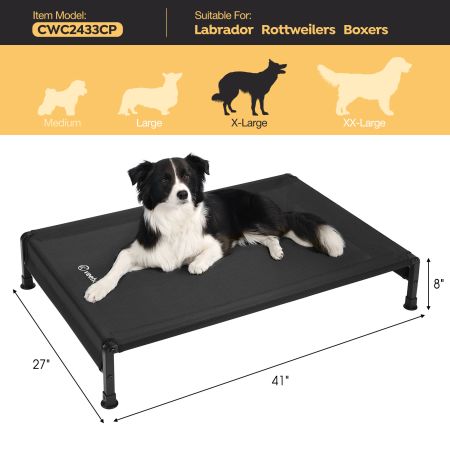 Size Dimensions Weight L 35"L×22"W×7"H 8.20lbs XL 41"L×27"W×8"H 9.30lbs XXL 47"L×29"W×8"H 11.00lbs Item Number CWC2433CP Weight 1.00lbs Species Dogs Bed Shape Rectangular Product Feature Durable, No-Slip, Stable General Material Iron, Metal, Plastic Bed Type Sales Cover Material Teslin Fabric Fill Material N/A Lifestage All Lifestages Assembly Required Yes Tools Included Yes - Video Tutorial