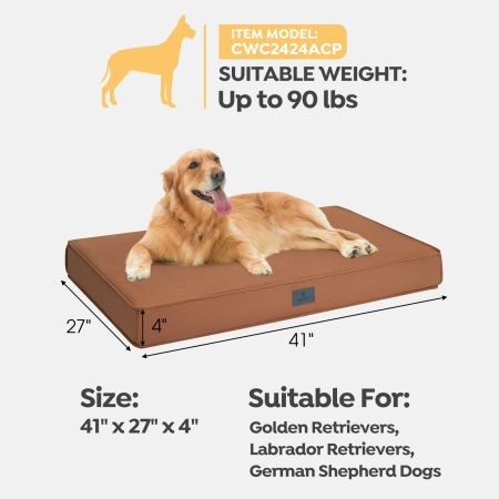 Size Dimensions Weight Suggested Pet Weight XL 41"L×27''W×4''H 5.70lbs up to 90lbs XXL 47"L×29''W×4''H 6.70lbs up to120lbs Item Number CWW2424CP Weight 1.00lbs Species Cats, Dogs Bed Shape Rectangular Product Feature Anti-Slip, Orthopedic, Removable & Washable Cover Cover Material Polyester Bed Type Sales Fill Material Memory Foam Lifestage All Lifestages Assembly Required No Tools Included N/A The cover is removable and can be machine or hand washed.