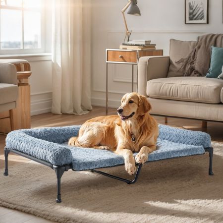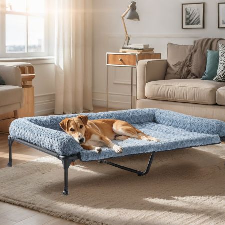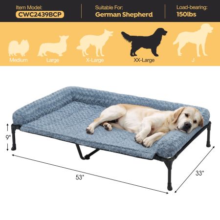 Size Dimensions Weight Suggested Pet Weight M 35"L×22"W×7"H 7.70lbs up to 70lbs L 41"L×27"W×9"H 9.30lbs up to 90lbs XL 47"L×29"W×9"H 11.90lbs up to 150lbs XXL 53"L×33"W×9"H 15.00lbs up to 150lbs 3XL 59"L×37"W×9"H 18.10lbs up to 150lbs Item Number CWC2439BCP Weight 7.70lbs Species Dogs Bed Shape Rectangular Product Feature Breathable, Removable & Washable Mat General Material Iron, Metal Bed Type Elevated Beds Cover Material Faux Fur, Teslin Fabric Fill Material N/A Lifestage All Lifestages Assembly Required Yes Tools Included No - Video Tutorial