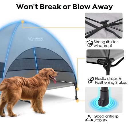Introducing the veehoo elevated pet bed with breezy tent, your pets’ ultimate outdoor sanctuary. This bed offers 99% UV protection, safeguarding them against the sun's intense rays. Its weather-resistant fabric ensures dryness in all conditions. Three mesh windows provide impeccable ventilation, creating a cool, airy retreat for your pets. Below a breathable teslin mat enhances comfort. Built to last with windproof ribs and anti-slip straps, it seamlessly combines comfort and stability for your cherished pets.
