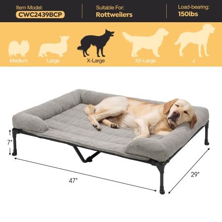 Size Dimensions Weight Suggested Pet Weight XL 47"L×29"W×9"H 11.90lbs up to 150lbs Item Number CWC2439DCP Weight 1.00lbs Species Dogs Bed Shape Rectangular Product Feature Breathable, Removable & Washable Mat General Material Iron, Metal Bed Type Elevated Beds Cover Material Teslin Fabric, Corduroy Fill Material N/A Lifestage All Lifestages Assembly Required Yes Tools Included No - Video Tutorial