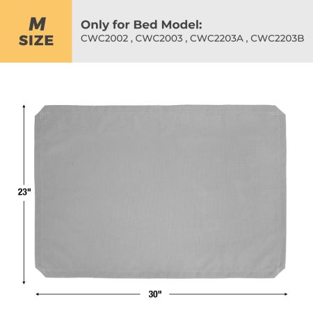 Size Dimensions Weight M 30"L×23"W×0.2"Th 0.80lbs L 40"L×28"W×0.2"Th 1.30lbs XL 47"L×30.5"W×0.2"Th 1.50lbs XXL 58"L×36.5"W×0.2"Th 2.00lbs Item Number CWCD2002CP Compatible Product Model CWC2002,CWC2003,CWC2203A,CWC2203B Weight 1.00lbs Product Feature Breathable, Cooling, Durable Cover Material Teslin Fabric Fill Material N/A Lifestage All Lifestages Assembly Required No Tools Included N/A This dog bed cover is designed for the bed model: CWC2002CP,CWC2003CP,CWC2203ACP,CWC2203BCP. Bed frame not included, purchase separately.