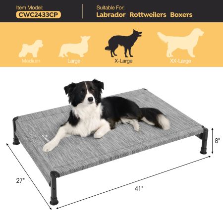 Size Dimensions Weight L 35"L×22"W×7"H 8.20lbs XL 41"L×27"W×8"H 9.30lbs XXL 47"L×29"W×8"H 11.00lbs Item Number CWC2433CP Weight 1.00lbs Species Dogs Bed Shape Rectangular Product Feature Durable, No-Slip, Stable General Material Iron, Metal, Plastic Bed Type Sales Cover Material Teslin Fabric Fill Material N/A Lifestage All Lifestages Assembly Required Yes Tools Included Yes - Video Tutorial